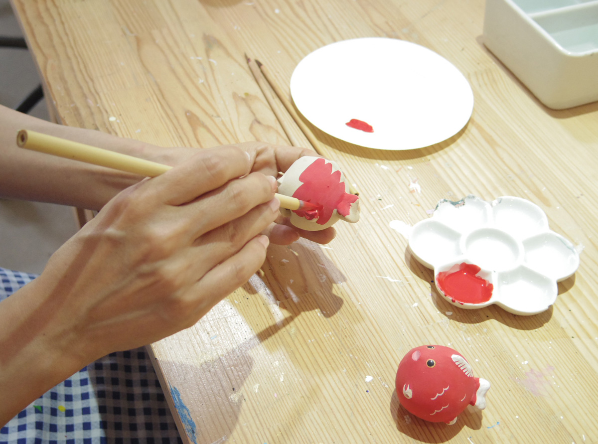 博多旧市街のど真ん中に立つレトロビルで体験できる「博多人形の絵付け」が、モノづくり初心者でもかんたんにハイクオリティの作品が作れると、博多女子の間で話題です。ダルマやネコ、金魚などを象った素焼きの人形への彩色作業は、無心になってストレスも解消できるひと時。完成品も、ずっと眺めていられるかわいさです。