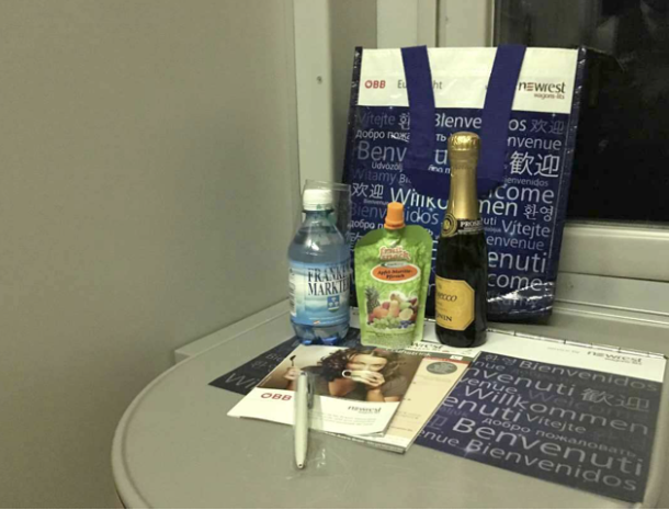 チケットの検閲とともに、翌朝の朝食を選んですぐに就寝タイム。今回は、22時47分ウーディネ発、翌朝7時46分に「ウィーン・マイトリンク」駅到着予定という約9時間の寝台列車旅となります。個室にはテーブルをひっくり返すと使える収納形の洗面台が備え付けられていて、ウェルカムシャンパンやスナック、タオル、スリッパ、耳栓なども用意されています。至れり尽くせりのおもてなしは、まさに「動くホテル」。女性一人なら、楽々眠れるくらいのスペースが確保されているので初心者さんでも安心です。