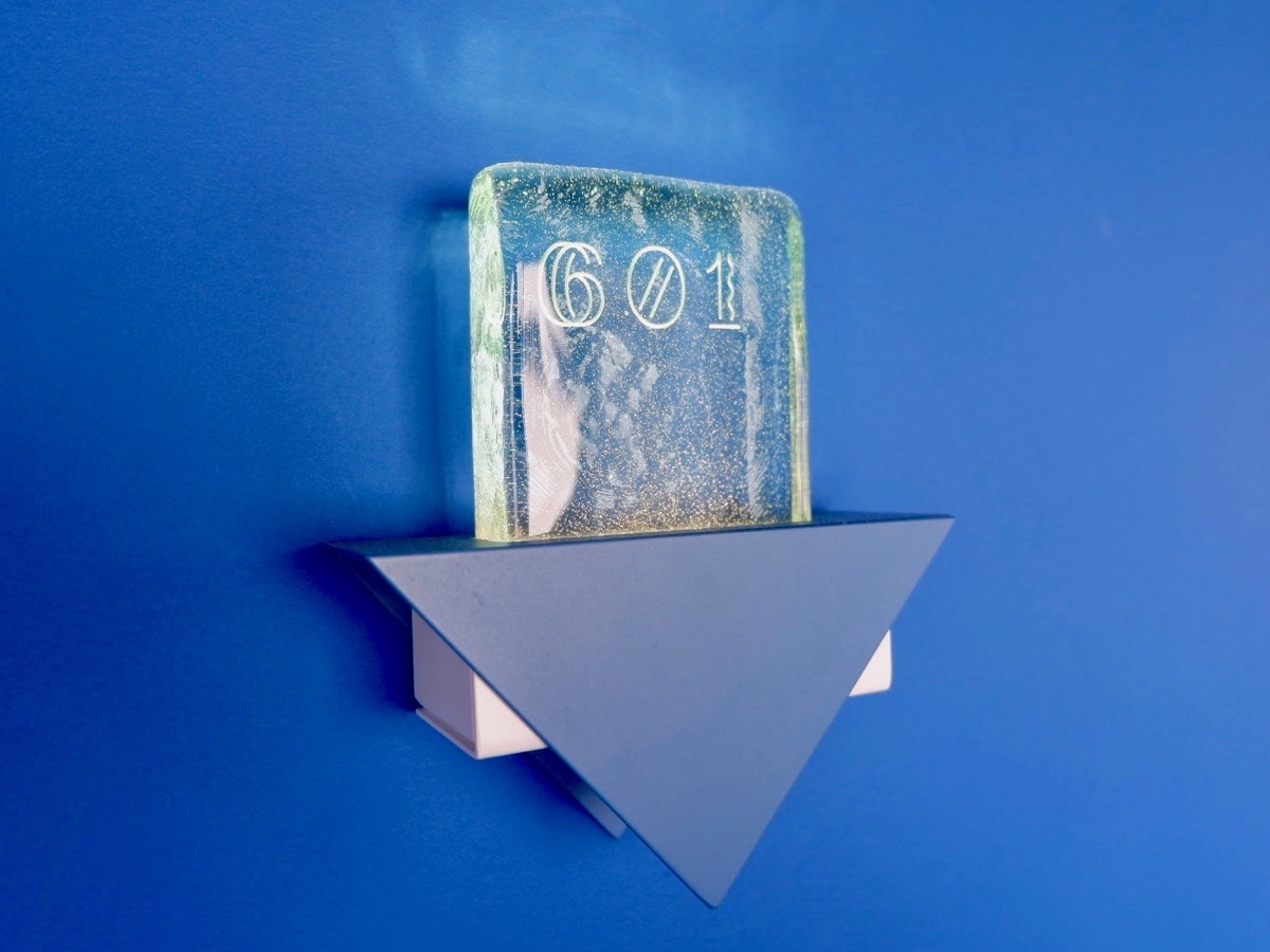 部屋番号のサインは、厚みのある手作りガラスを使用。照明がつくと壁に水面のような影ができるのも、ぜひチェックしてほしいポイントのひとつです。