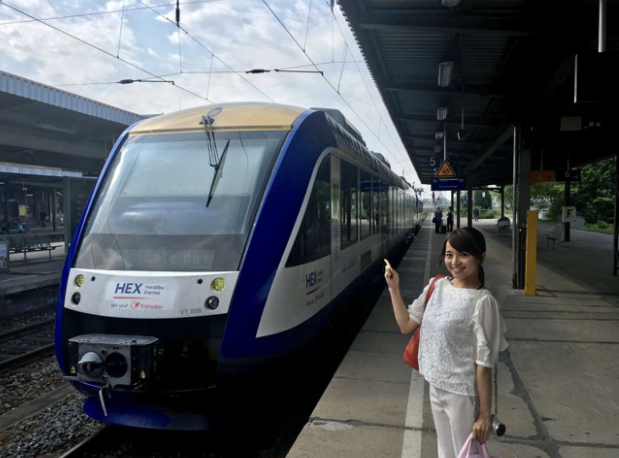 2階建ての快速列車に揺られること約1時間半。マクデブルク駅で私鉄ローカル線・「ハルツ・エルベ急行線(Harz Elbe Express・通称HEX)」に乗り換えます。HEXはハルツ地方の地域鉄道で、3両編成のこじんまりとしたディーゼルカーが特徴の路線。こちらの乗車にも、もちろんユーレイルパスが使えます♪出発地の首都・ベルリンの高層ビル群とは対照的な草原が広がる車窓に癒されながら「クヴェトリンブルク(Quedlinburg)」駅へと足を伸ばします。