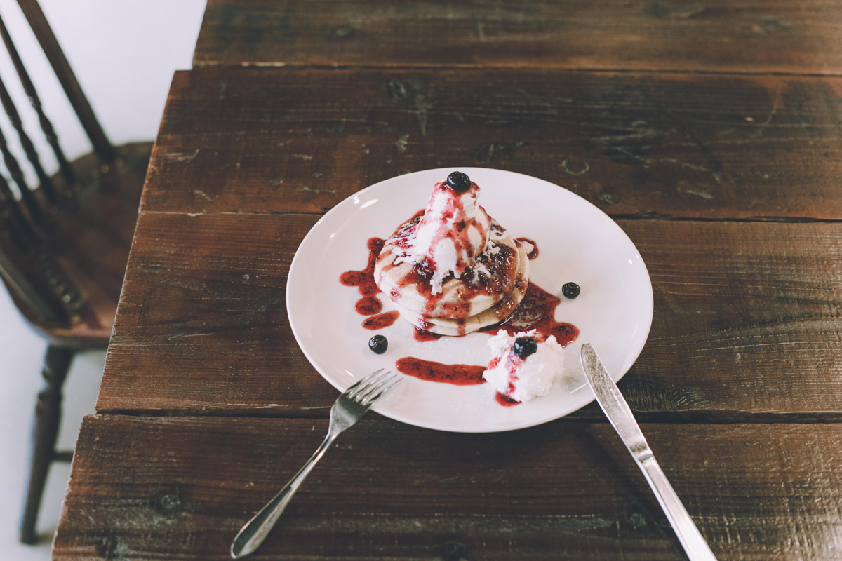 今日の目的だった「ブルーベリーパンケーキ」。気取らない空間でリラックスしながら食べるパンケーキは至福。このほかにも「プレーンパンケーキ」や季節によって限定のメニューが用意されているそう。