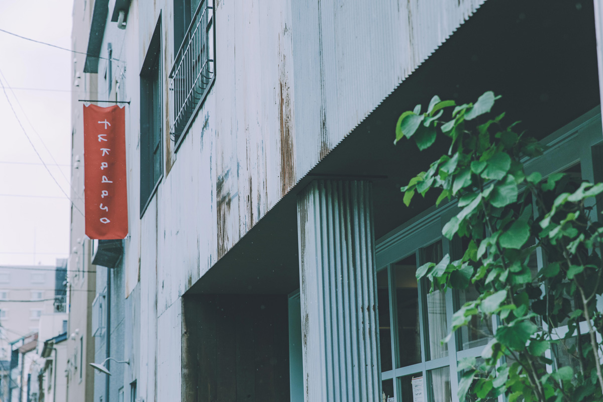 一見、カフェとは思えない大きな箱のような佇まいの建物。トタン屋根に覆われたこの箱の1階スペースがfukudaso cafeの入り口です。
