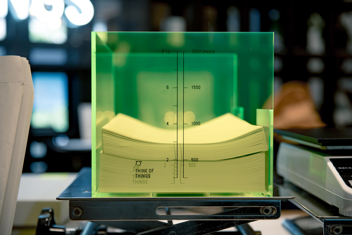 不思議なボックスに重ねられたA4サイズの用紙。ミシン目で繋がった、蛇腹状の連続記録用紙「ZYABARA PAPER(ジャバラペーパー)」。" 思考を止めない連続性 “がコンセプトのひと続きのペーパーは、店頭で量り売りされており「100g270 円(25 枚相当)」から10g単位で好きな分量を購入することができます。