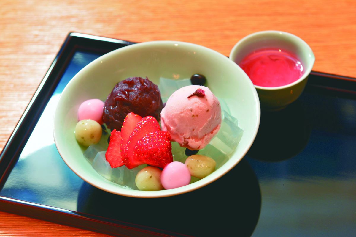 コレド室町3の1階にある『鶴屋𠮷信』の彩りが春らしい「桜あんみつ」1296円はいかが。
