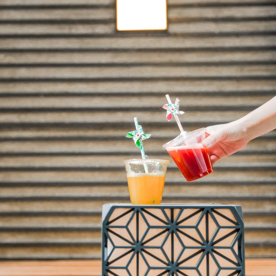 老舗果物店『ビストロサブリエ イマノフルーツファクトリー』の「デコポンジュース」400円(左)と「あまおうジュース」500円(右)は、飲み歩きにぴったりです。このほかにも、お寿司や鰻くりから焼など、老舗や名店の特別オリジナルメニューがこの日だけ味わえます。