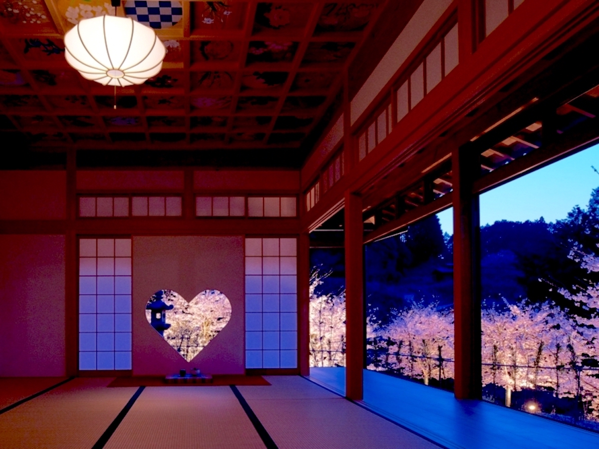 本堂と客殿の周囲に植えられた15本の桜が照らし出され、猪目窓も淡いピンク色で染まる風景はとってもロマンチック。17時30分~と19時30分~の2部制で、どちらも完全予約制のため、混雑することなく落ち着いて景色を楽しむことができます。