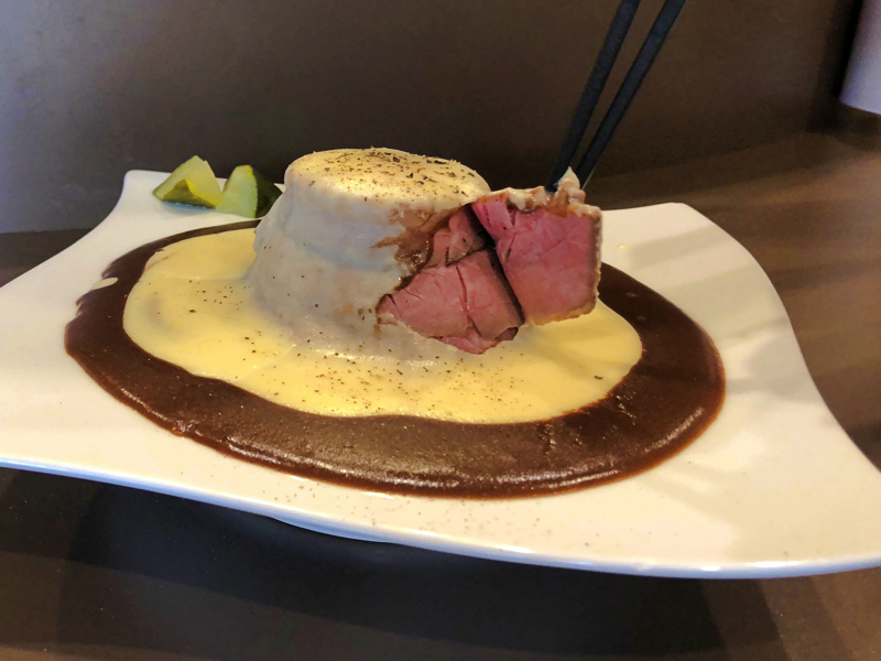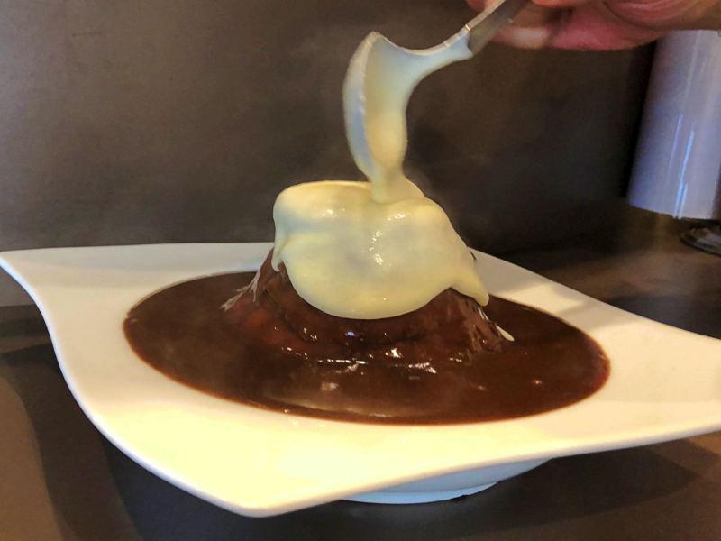 ローストビーフの上にこだわりのカレールーをたっぷりとかけ、さらに真っ白なポテトクリームソースをとろ〜り。このビジュアルは雪化粧した富士山をイメージしているのだそうです。