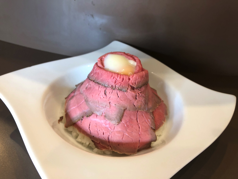 「J's丼」のカレーがかかる前の状態を見てみると…ごはんと温泉卵がローストビーフでぐるぐる巻きになっています。山のようなローストビーフと温泉卵…この最高の組み合わせにテンションが上がります!