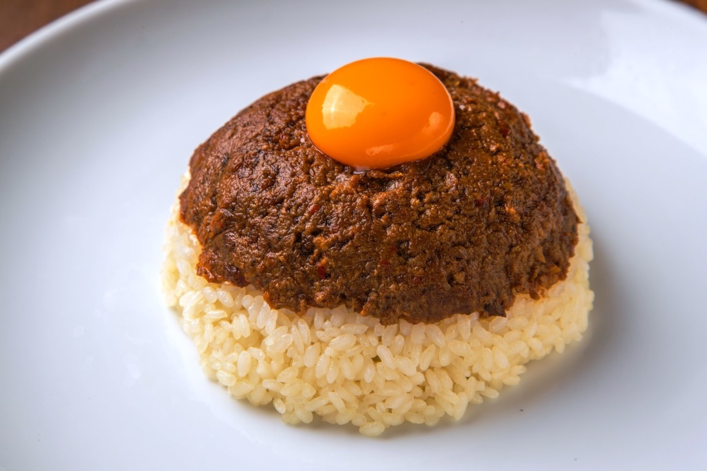 ぜひ実践していただきたいのが、ご飯の上にのっている温泉卵を割り、ローストビーフに黄身とカレーとソースを絡める食べ方。濃厚なカレーとクリーミーなポテトソース、そしてとろける卵を、ジューシーなお肉と一緒にぎゅむ、ぎゅむと噛みしめてください。これまでにない、至福の味のハーモニーが口に広がります。