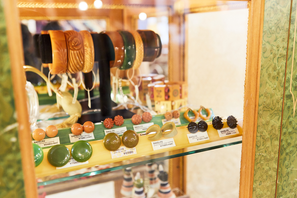 世界で初めて植物以外の原料から人工的に合成されたプラスチック“ベークライト”のアクセサリー。希少価値が高く、古着女子の間で大人気のアイテムです。