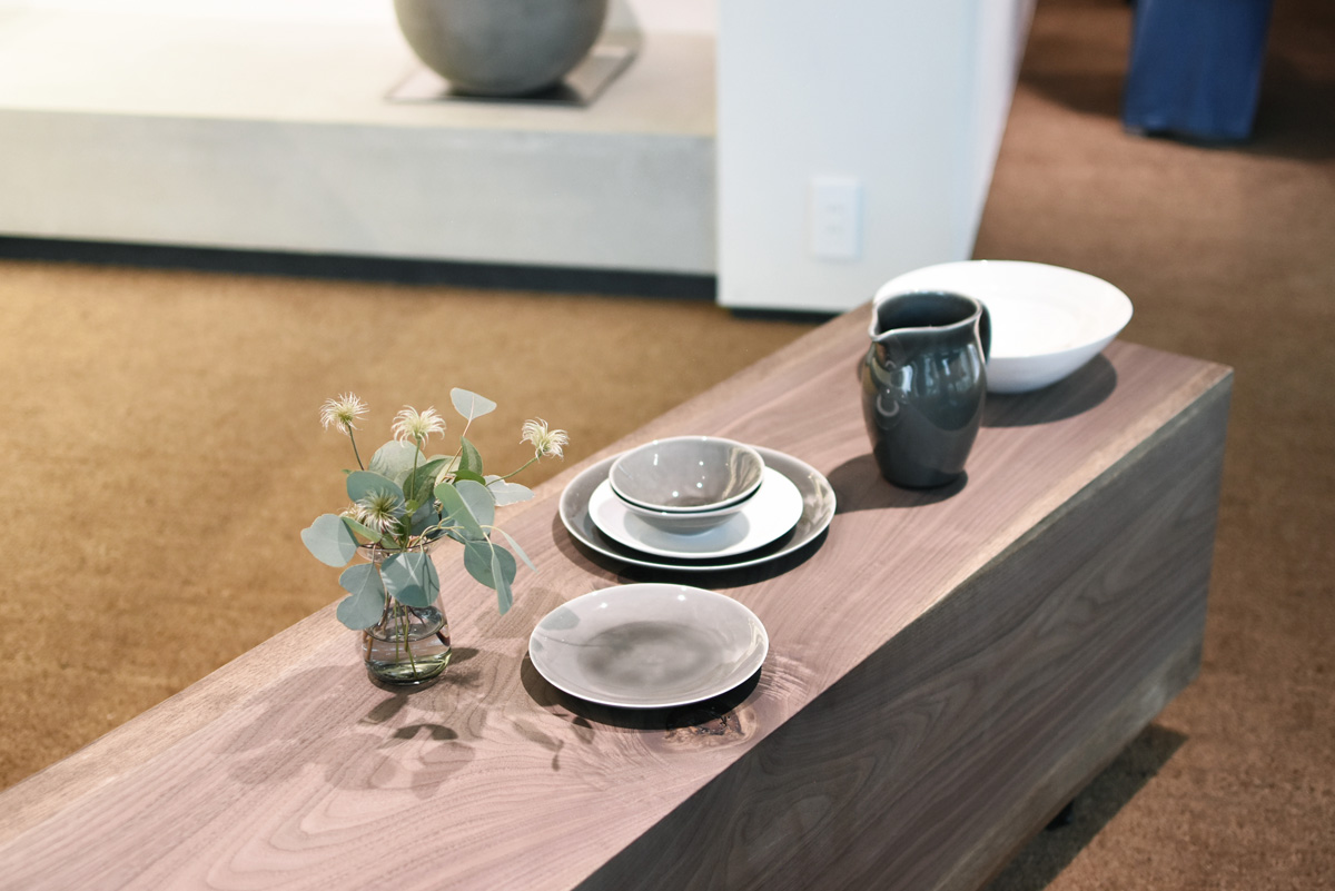 コンクリート打ちっぱなしのおしゃれな建物を入ると、壁一面の窓からやさしい日差しが差し込みます。太陽をいっぱい浴びて、きらきらと輝くテーブルウェアたち。上質な佇まいで、静かな存在感を放っています。