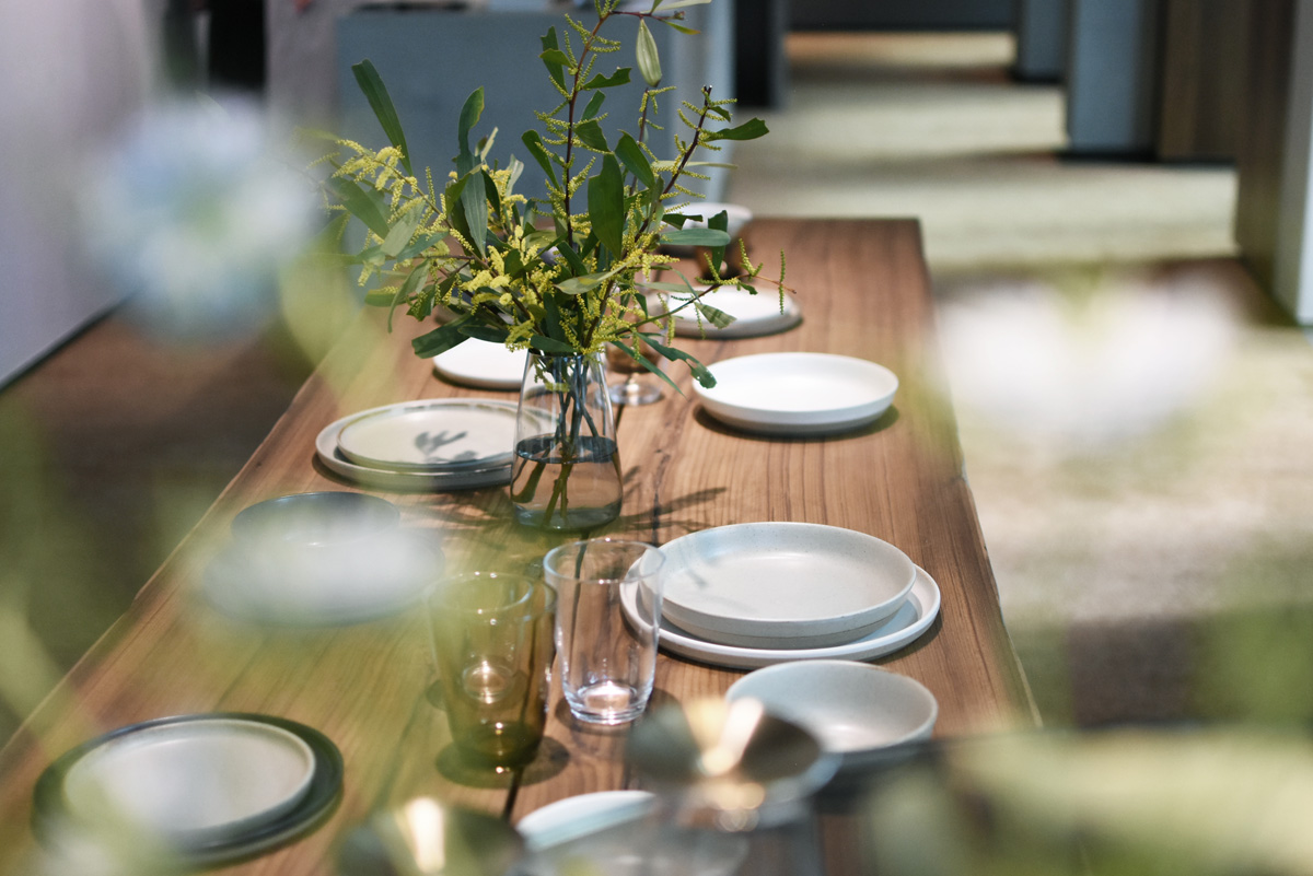 2019年3月21日にオープンした日本初の直営店「KINTO STORE Tokyo」では、そんなKINTO製品の魅力を体感できる展示販売が行われています。店内のテーブルには、食器のほか花々などグリーンも飾られていて、まさに“理想の食卓”のようなコーナーも。