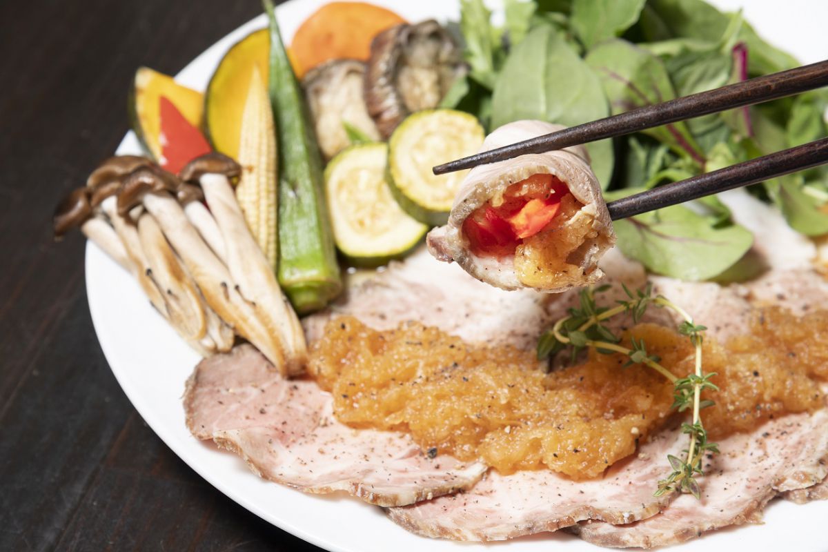 そんな神戸豚のローストポークはやわらかく、噛むほどにコクのあるうま味があふれます。また、脂身が少ないため、ヘルシーにいただけるのもうれしいポイント。お好みの野菜をたっぷり巻いていただきましょう。