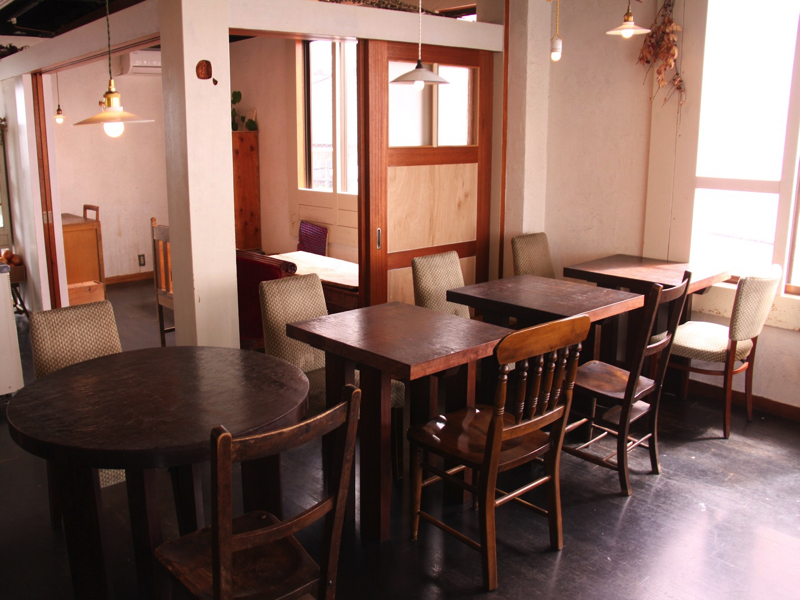 ウッディで柔らかな温もりに包まれた店内。あえてバラバラの種類で揃えられた椅子などの、気取りすぎていないちょうどよい抜け感が「コマグラカフェ」の居心地のよさに一役買っています。
