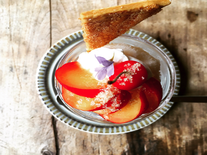お次は、春の期間限定の「プラムとさくらんぼのパフェ」(1200円)。ミルクアイス、プラムのジャム、クランブル、ヨーグルトクリーム、カモミールゼリー、さくらんぼの層に、たっぷりのプラムとさくらんぼ、三角のパイをトッピング!