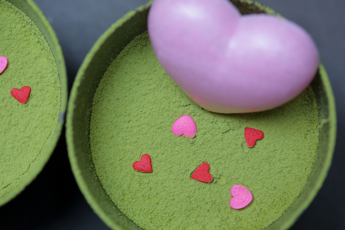 「和チーズケーキ」は、ハートのもなかと煎茶パウダーとのコントラストが美しい! スプーンですくえば、中はレアチーズケーキ。酸味があって爽やかです。
