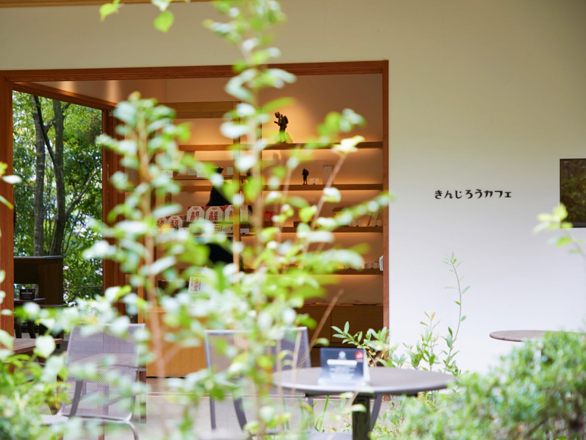 神社の杜の中にある「きんじろうカフェ」は、とにかく緑がいっぱい。心地よい風が通り抜けるテラス席だけでなく、全席がオープンエア。