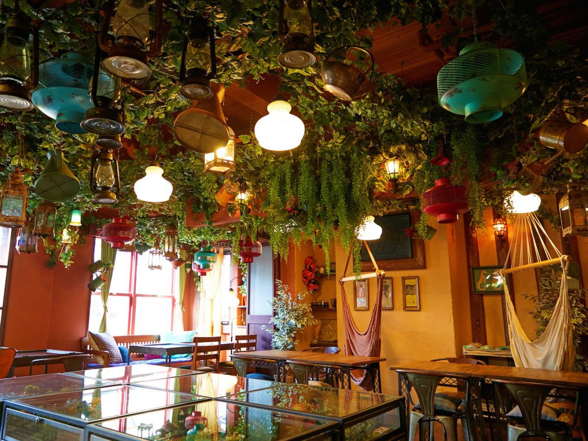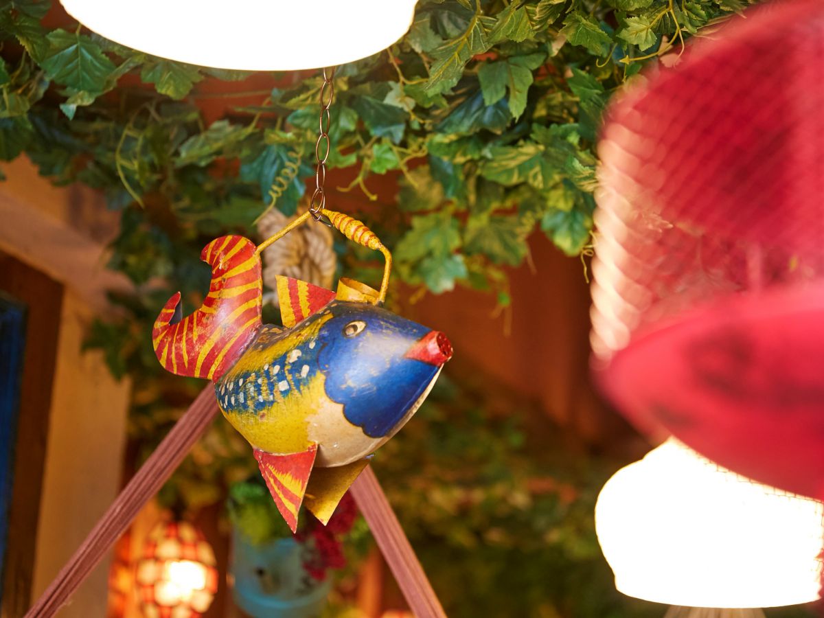 ランプと一緒に天井からぶら下がっていたカラフルな魚の正体は…、なんと“じょうろ”。SNS映えだらけのこの空間では、映えないものを探すほうが難しいくらい。