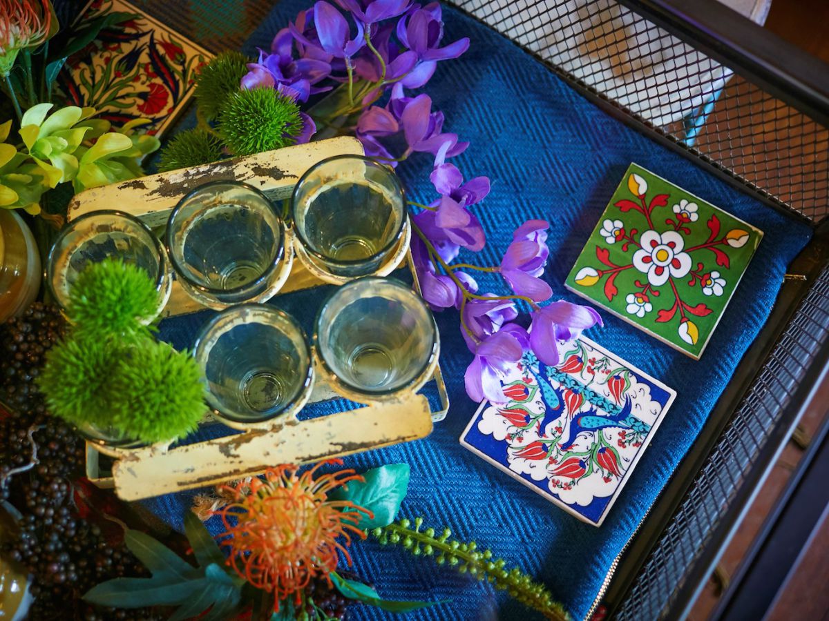ガラステーブルの下には、チャイグラスやハンドペイントのエスニックな絵タイルが。どれもインドで直接買い付けてきたものなのだとか。