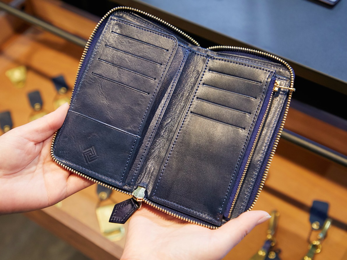こちらが、馬のお尻の部分からしか取れない希少性の高い高級革「コードバン」を使ったウォレット。キメが細かくなめらかなうえ、しっとりとした質感が特徴で、使い続けることでツヤ感や輝きを増すことから“革のダイヤモンド”ともよばれているそうです。