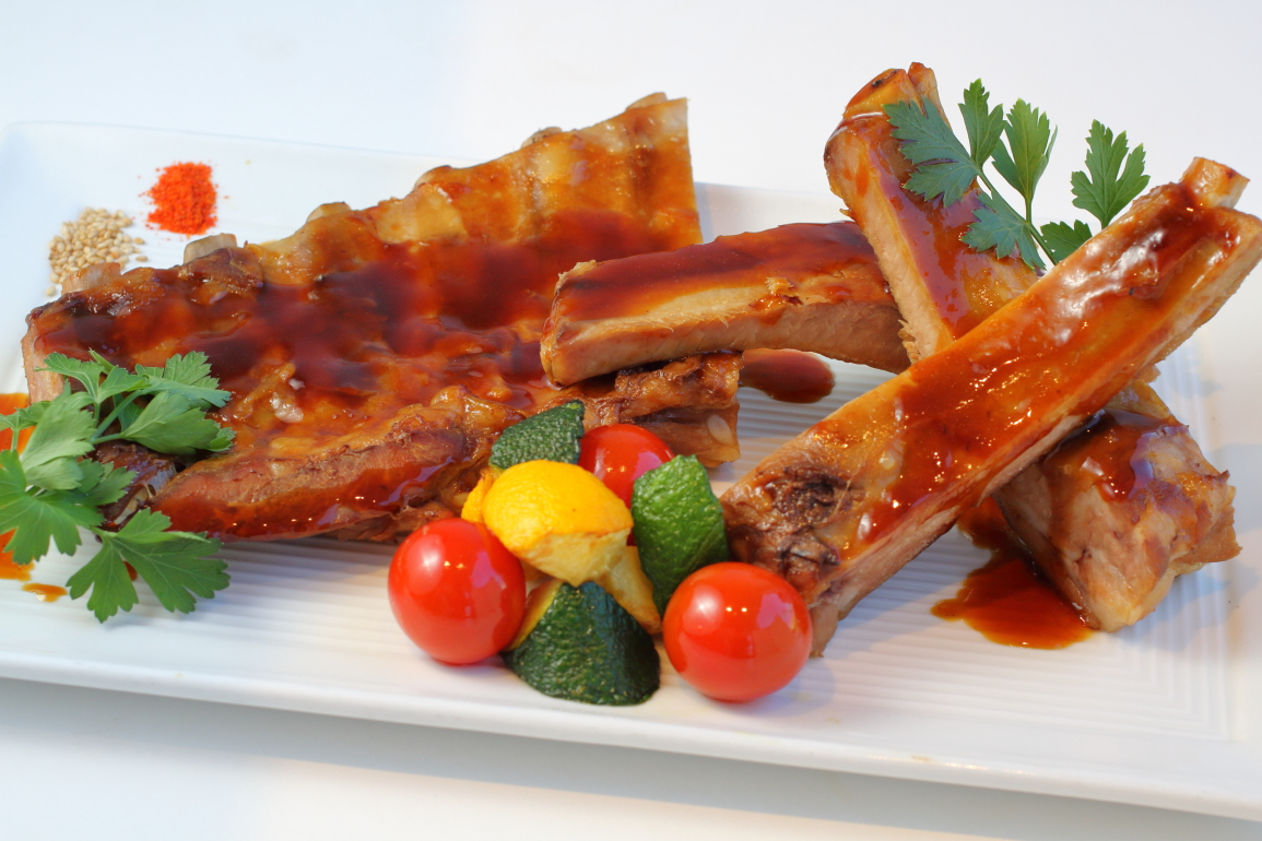 人気の「ポークスペアリブ」は、豚あばら肉を蒸してアク抜きし、2~3時間ほど醤油や酒で煮込んだあとにソースを塗って照り焼きにしたもの。ソースは煮汁に少量のバルサミコ酢、オレンジの搾り汁と皮を加えていて、甘辛く深みのある味わいです。