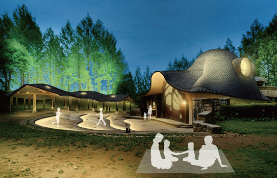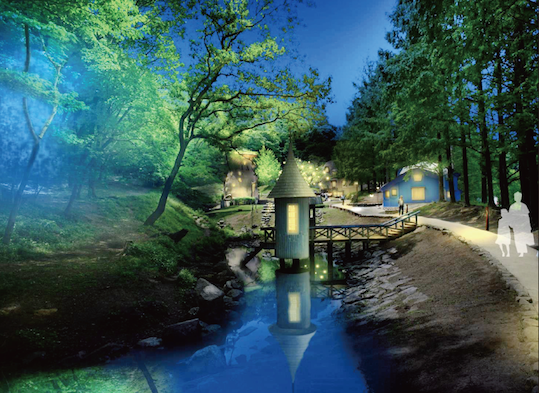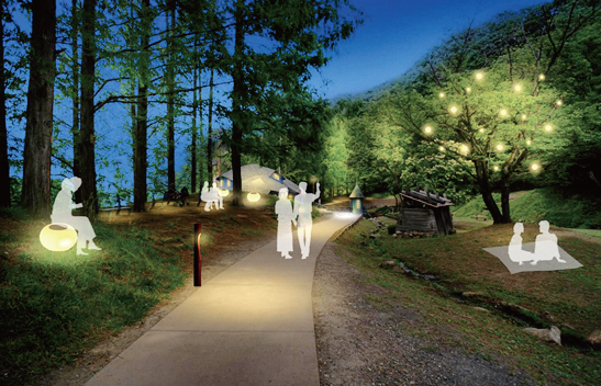 そして、公園そのものがまるで裏山を背景とした「小さな村」となるように作り出された夜間景観に注目。童話に登場するような個性的な建物が灯りに照らされて浮かび上がり、「ドキドキ・ワクワク」しながら公園全体を散策することができます。