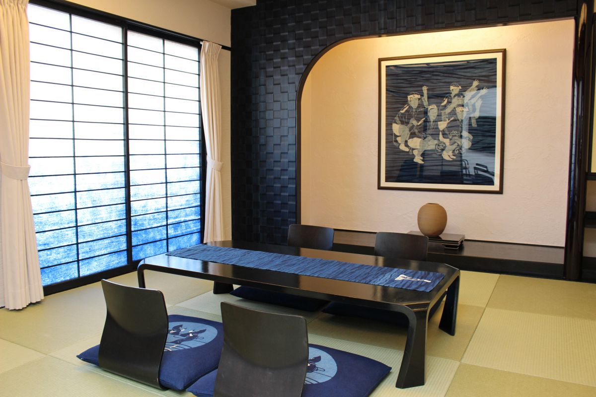 2019年2月には阿波藍の匠が伝統的な技法で仕上げた「阿波藍ルーム」も新たに誕生。4人の作家が4つの客室をそれぞれプロデュースしています。こちらは阿波踊りをテーマにしたお部屋。テーブルランナーや座布団、障子、さらにはコップまで藍色に染められていて、徳島の伝統工芸品を実際に使うことができます。