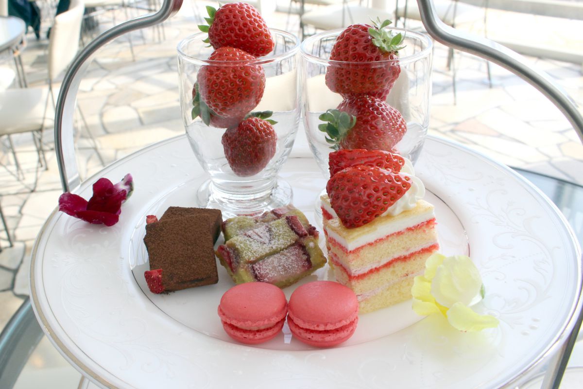 スイーツの種類は季節に合わせて変わります。冬から春にかけては「ストロベリーアフタヌーンティー」がテーマ。ケーキにマカロン、サンドイッチ、紅茶までイチゴ尽くしが味わえますよ。