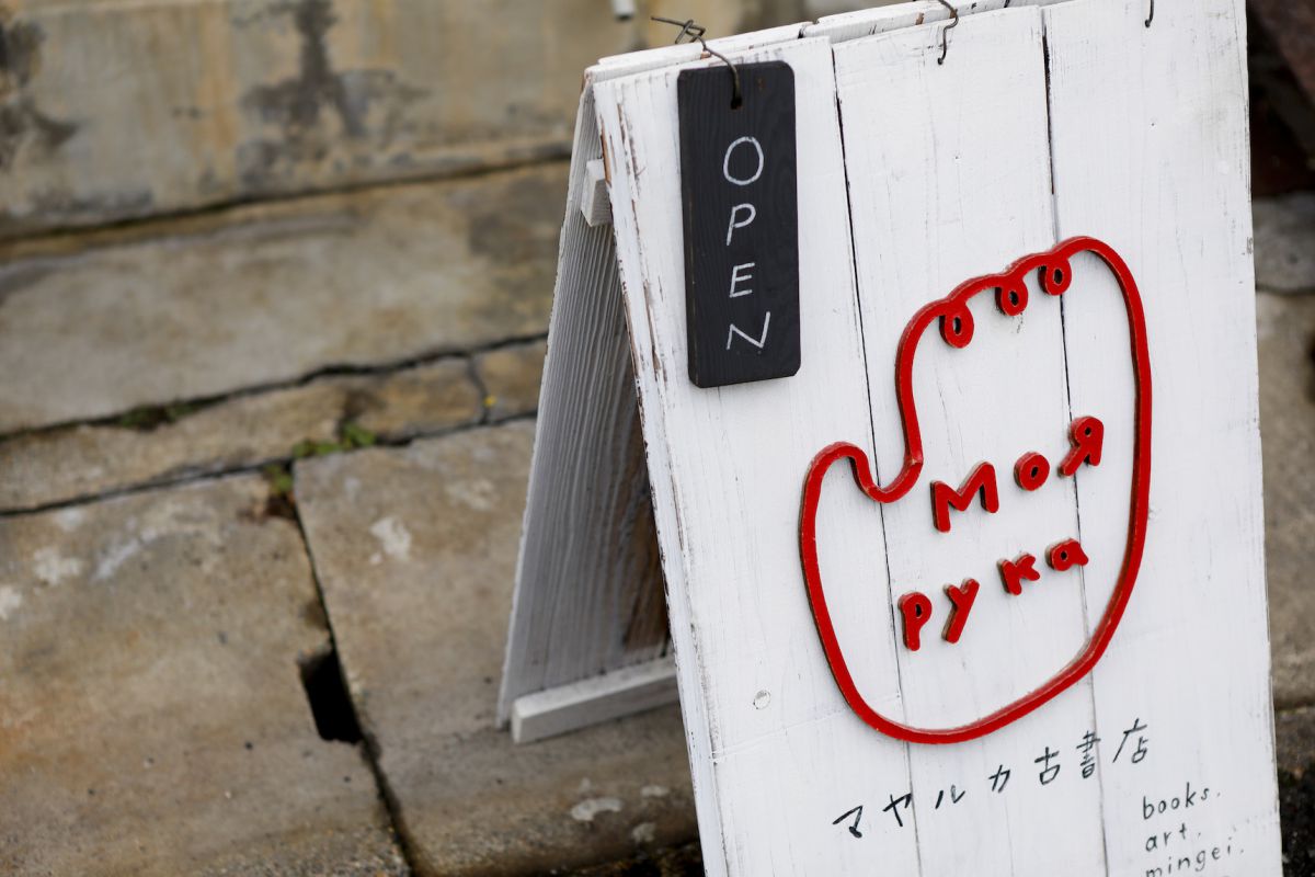“マヤルカ”とは、ロシア語で“私の手”という意味だそう。「手のひらでそっと包みたくなるような本や、作り手の気持ちが感じられるような手仕事品を届けたくて」と店主の中村さん。お店の前には真っ赤な手袋が描かれた看板が、ちょこんと佇んでいます。