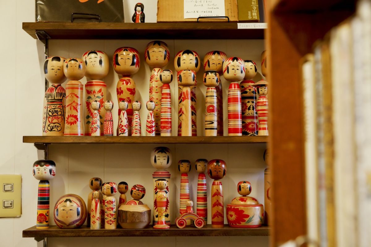 素敵な本が並ぶ店内で、目を引くのが木製の棚にずらりと並んだこけしの数々。大小を問わず、さまざまな表情やデザインが揃います。郷土玩具や民芸品に関する本も充実していて、わざわざ遠方から訪れるお客さんも多いとか。
