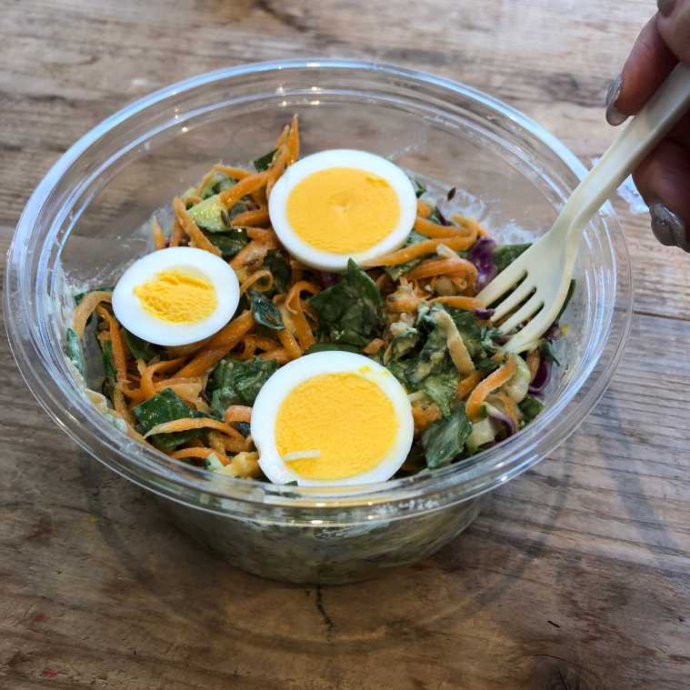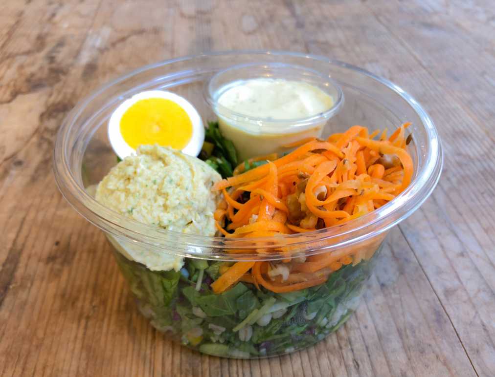 さらにスーパーフードのキヌアや押し麦など、10種類以上の体にいい食材がミックスされていて、栄養価も抜群です。その上にトッピングされているのはニンジンのラペ、ひよこ豆のフムス、ゆで卵とお腹も満足しそう。