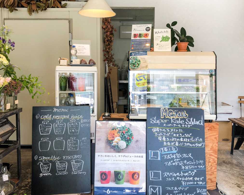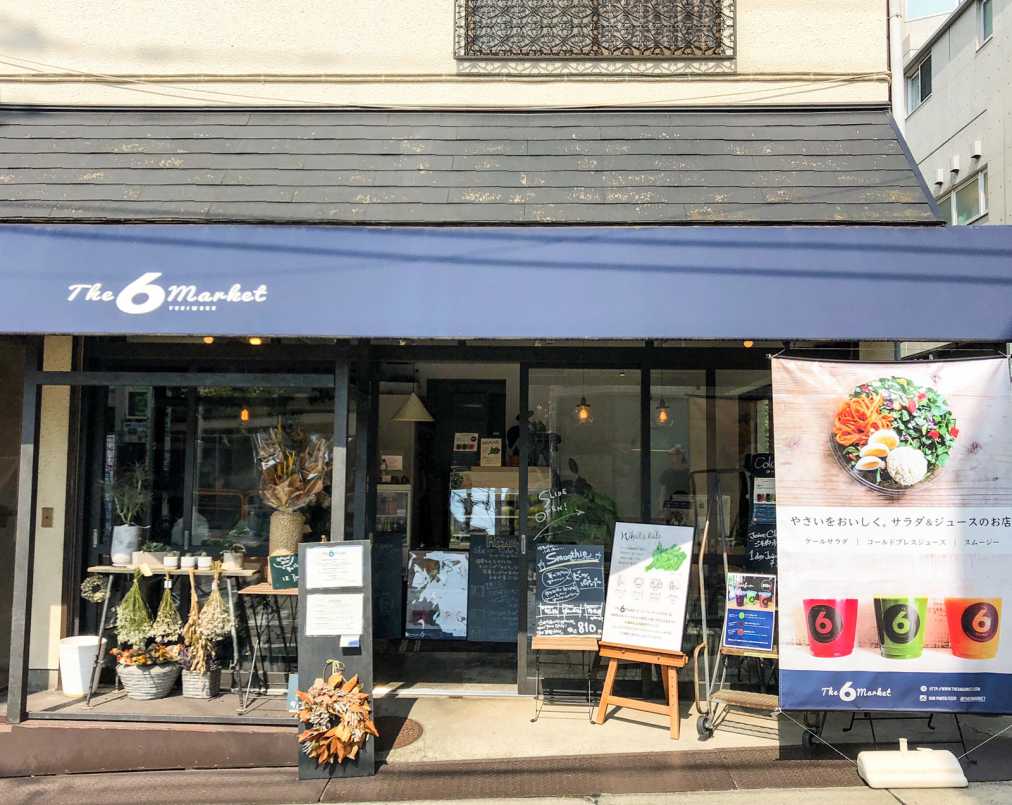 代々木上原駅から徒歩3分ほど、小さな坂の途中に「The6Market(ザ シックス マーケット)」が見えてきます。大きなサラダとジュースの看板が目印です。