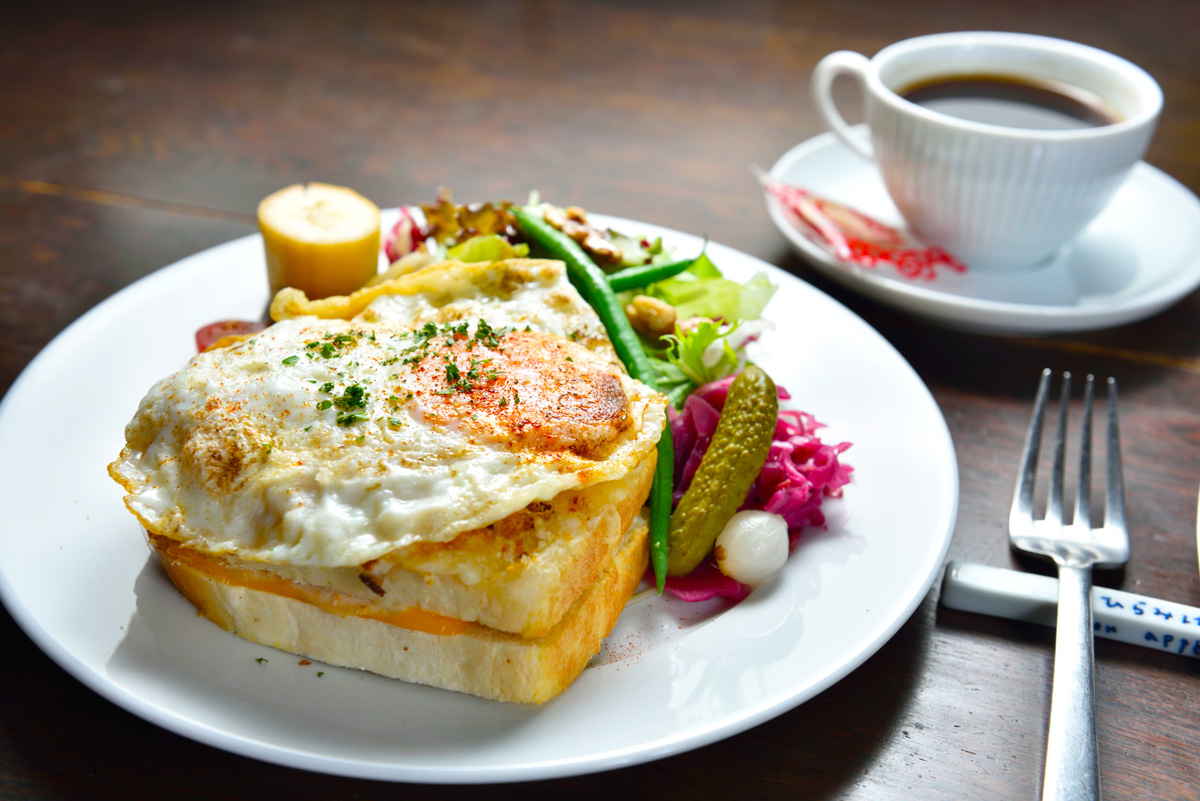 朝8時から営業のカフェで、腹ごしらえと参りましょう。モーニングのメインはハムとチーズ入りのホットサンドに目玉焼きをのせたクロックマダム、もしくは自家製キッシュから選べ、サラダ&コーヒーor紅茶付きで1425円です。