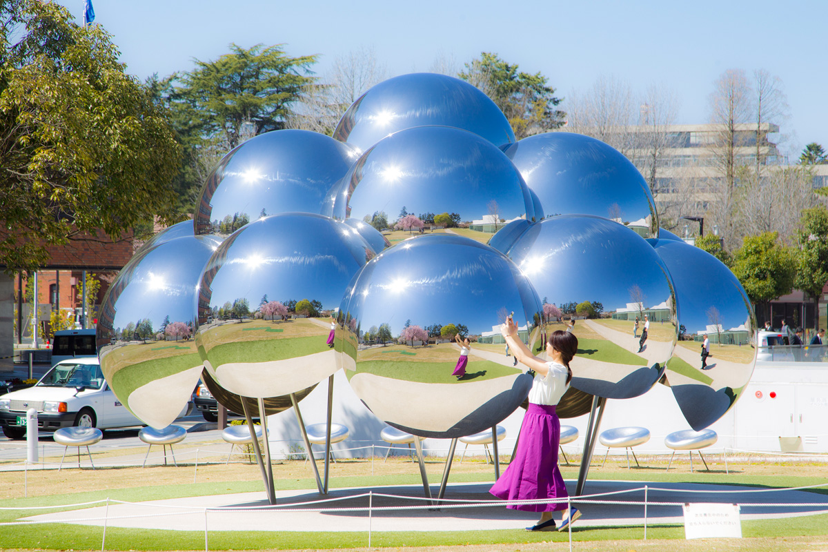 円形の建物の周囲は芝生に囲まれた無料の交流ゾーン。館内にも交流ゾーンがあり、通り抜けることもできます。写真は屋外にある球体のパビリオン「まる」。ステンレスの半球16個で構成され、いくつもの鏡に景色と自分が映ったユニークな写真が撮れるんです。内部に入ると鏡が反転し、これまた不思議な感覚に。