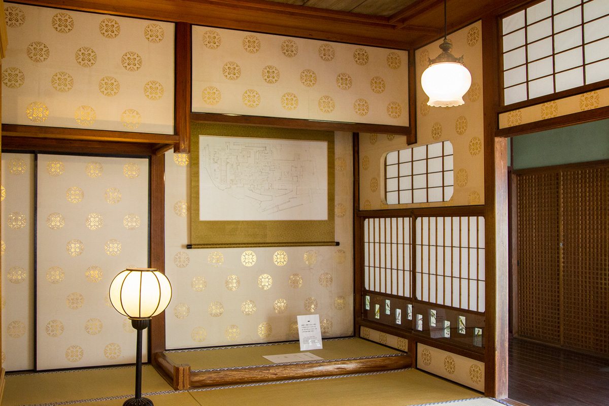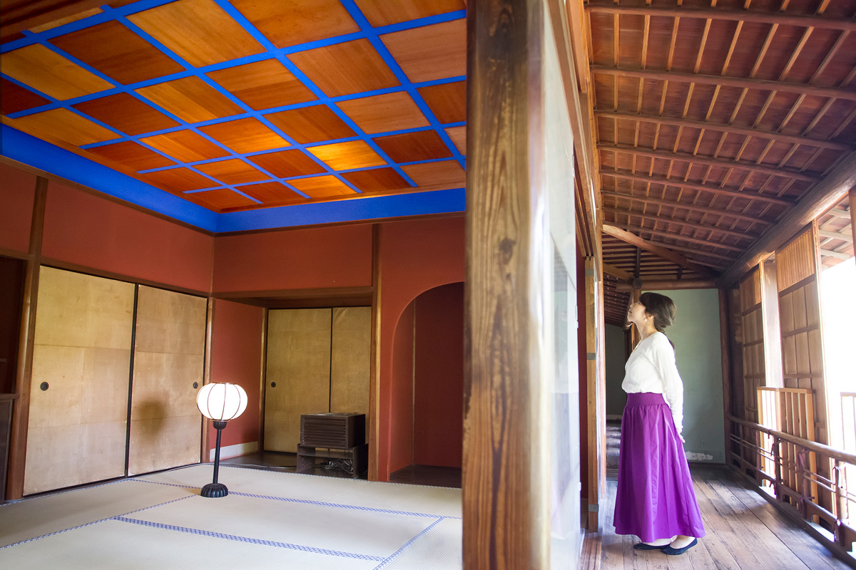 数寄屋風書院造りの2階には7室があり、接待用に使われていたんだそう。部屋ごとに異なる壁の色や天井は、今見てもモダンでハイセンス。写真の「群青の間」の天井にはフランスから輸入されたウルトラマリンブルーの顔料を使い、杉の木目を互い違いに配して変化をつけています。朱色の壁やゴールドのふすまも上品かつ華やか!