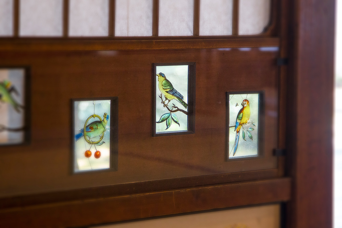 「松の間」は休息する部屋として使われたプライベートルーム。金具のないふすまの奥は武者隠しという隠し部屋をはさんで、「謁見の間」に通じています。書院障子の腰板(写真下)にはオランダ渡来のガラス絵が!光を通して、淡い色合いの小鳥の絵が浮き上がります。