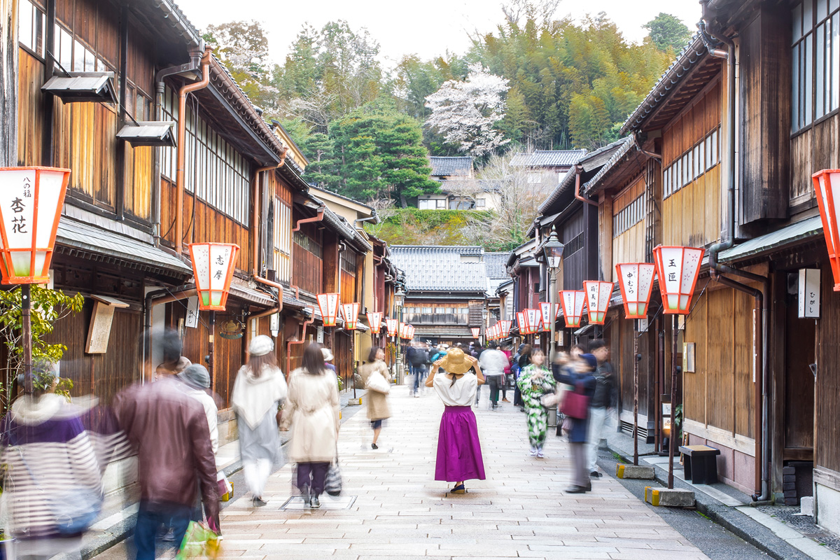 金沢を代表する茶屋街のひとつで、国の重要伝統的建造物群保存地区として、情緒ある町並みが守られている「ひがし茶屋街」。石畳の通りの両側には木虫籠(きむすこ)と呼ばれる細かい格子のはまった家々が並び、料亭や町屋カフェ、伝統工芸品のショップが軒を連ねています。