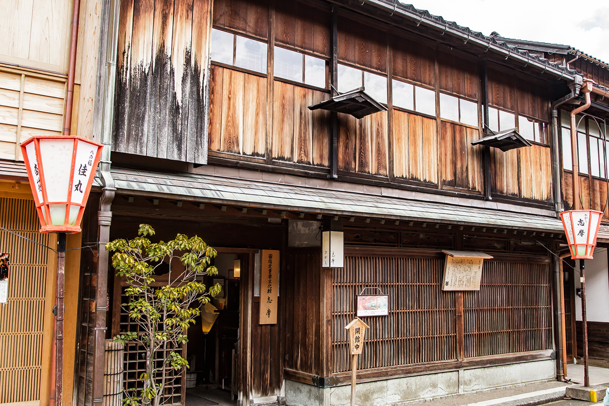 「ひがし茶屋街」のメインストリートにあり、江戸時代後期の格式高いお茶屋建築をそのまま残した「志摩」。茶屋建築は2階を客間(座敷)とするため、2階部分を高く造り、通りに面して高欄と張り出しの縁側を設けているのが特徴です。