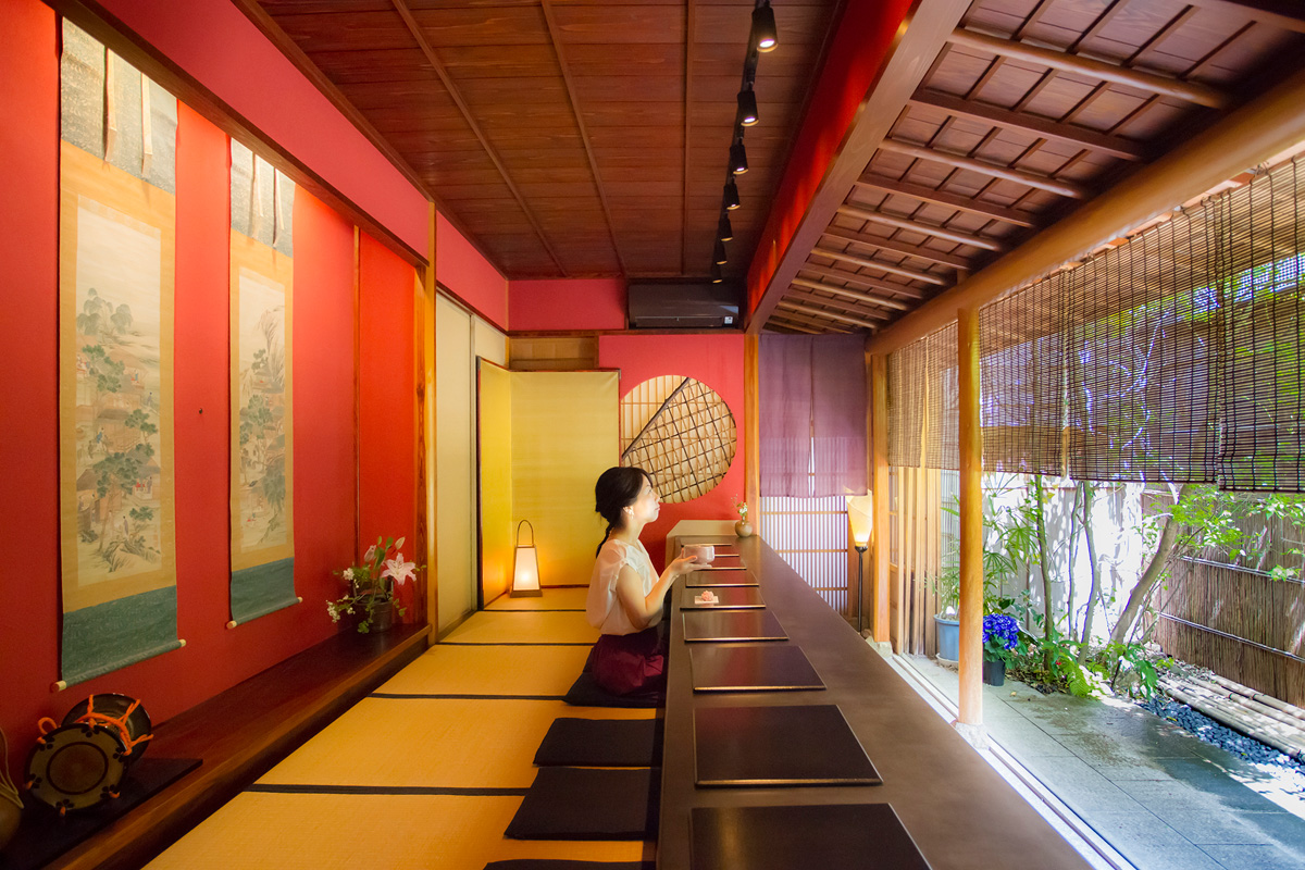 別棟の「寒村庵」も江戸時代はお茶屋だったところ。庭を正面に眺められるカウンターに11席があり、お抹茶がいただけます(生菓子付き700円、干菓子付き500円)。