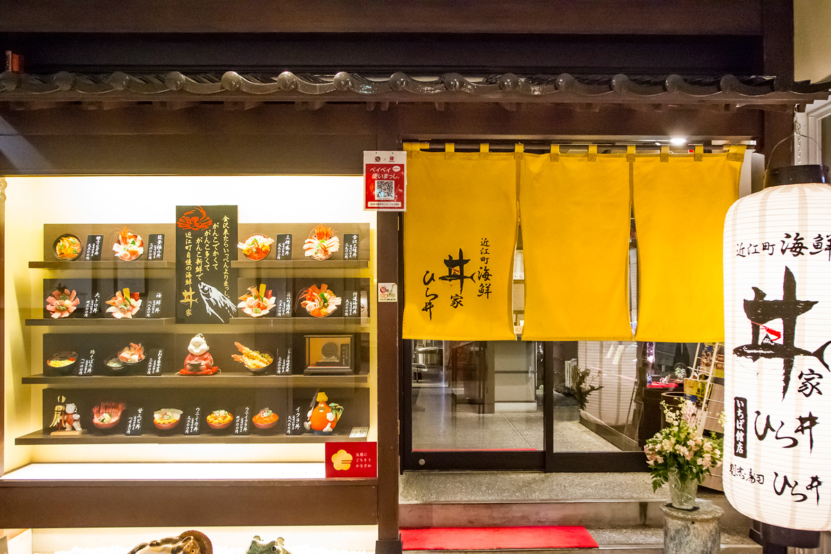 近江町いちば館の2階飲食店フロアの一角、黄色の暖簾と大きな提灯が目印の「ひら井 いちば館店」。近江町市場内のお店は夕方閉店が多いなか、こちらは水曜以外、21時まで通しで営業しているから、夕ご飯や遅めのランチでも行けちゃうんです。店内はテーブル席と小上がりのほか、カウンター席もあり、おひとり様でも気軽に入れます。