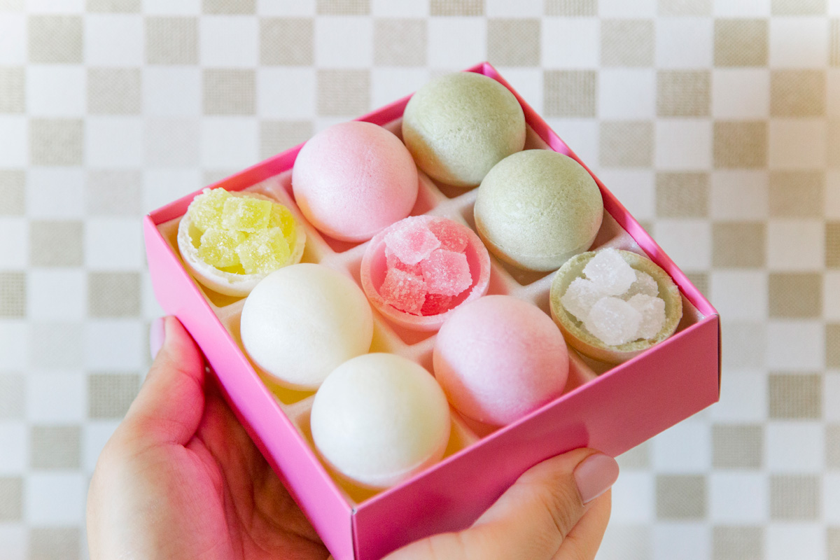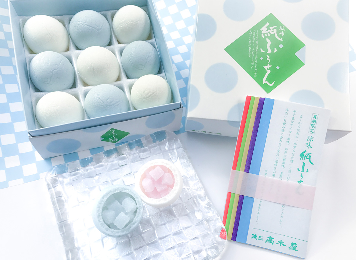 「菓匠 髙木屋」のおすすめは「紙ふうせん」(9個入り648円)。まん丸の最中に、砂糖をまぶしたゼリーが入っていて、宝石みたい!上の写真のスタンダードな紙ふうせんは、グリーン=白ワイン風味、ピンク=ぶどう風味、白=レモン風味のゼリー入り。下の写真は夏季限定の「涼味紙ふうせん」(9個入り648円)で、水色=サイダー風味、白=桃風味です。どちらも紙ふうせんが折れる5色の折り紙付きというのも気が利いています。