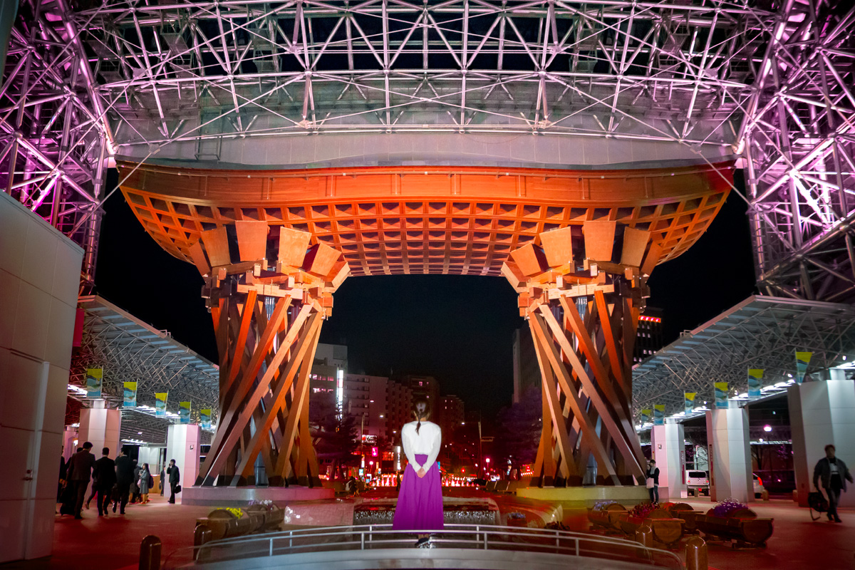 観光の足は金沢駅兼六園口(東口)からバスを利用するのが便利です。世界で最も美しい駅14駅のひとつに選出された金沢駅はフォトスポットとしても大人気。金沢の伝統芸能である能楽で使われる鼓をイメージした重厚な鼓門(つづみもん)がそびえたっています。
