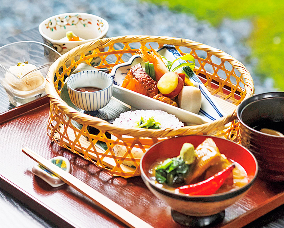 「ひがし茶屋街」でランチするなら「十月亭(じゅうがつや)」へ。ミシュラン二つ星獲得の「日本料理 銭屋」がプロデュースする日本料理店で、ランチでは旬の味覚を華やかに盛り込んだ竹かご弁当(2830円)がいただけます。金沢の郷土料理、治部煮をセットにするのもおすすめ(3640円)。