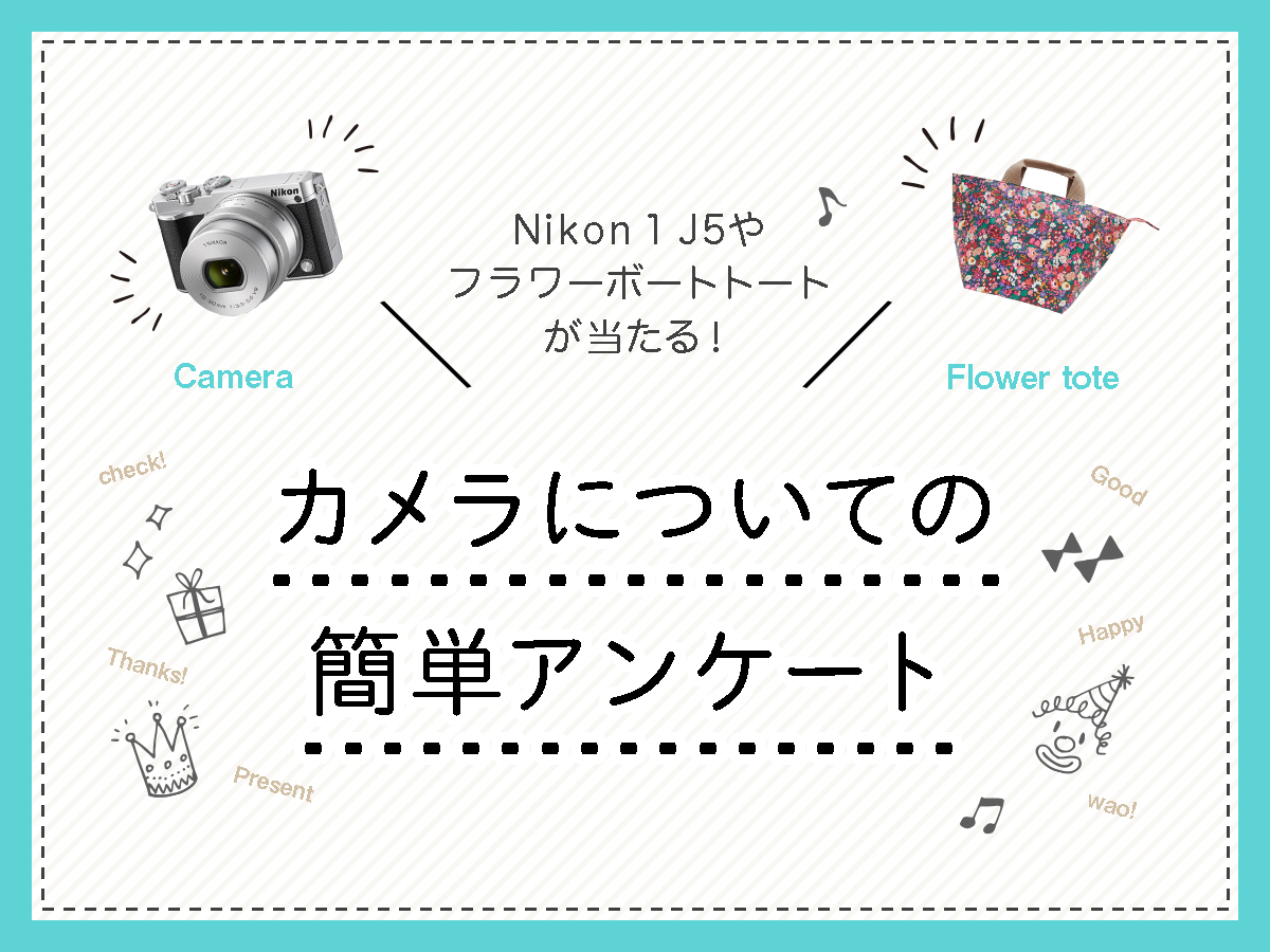 一眼レフの魅力が十分わかったら、ホンモノのカメラが欲しくなったはず。今ならカメラについての簡単なアンケートに答えてくれた方の中から抽選で、記事の中にも登場したNikon 1 J5 標準パワーズームレンズキットを3名様に、キュートな小花柄がかわいいフラワーガーデン ボートトートを30名様にプレゼント!一眼レフを持って、初夏のステキな写真をたくさん撮ってくださいね。