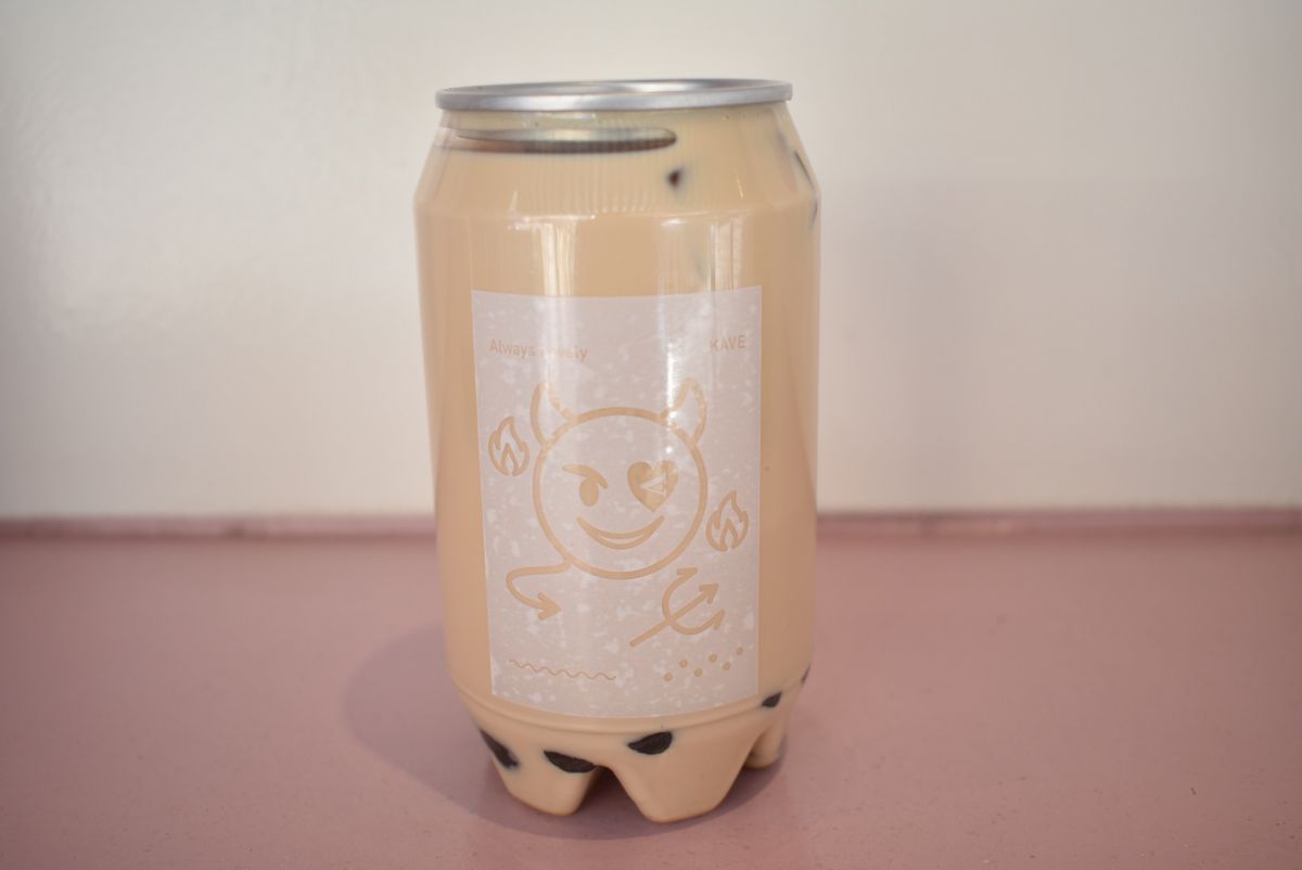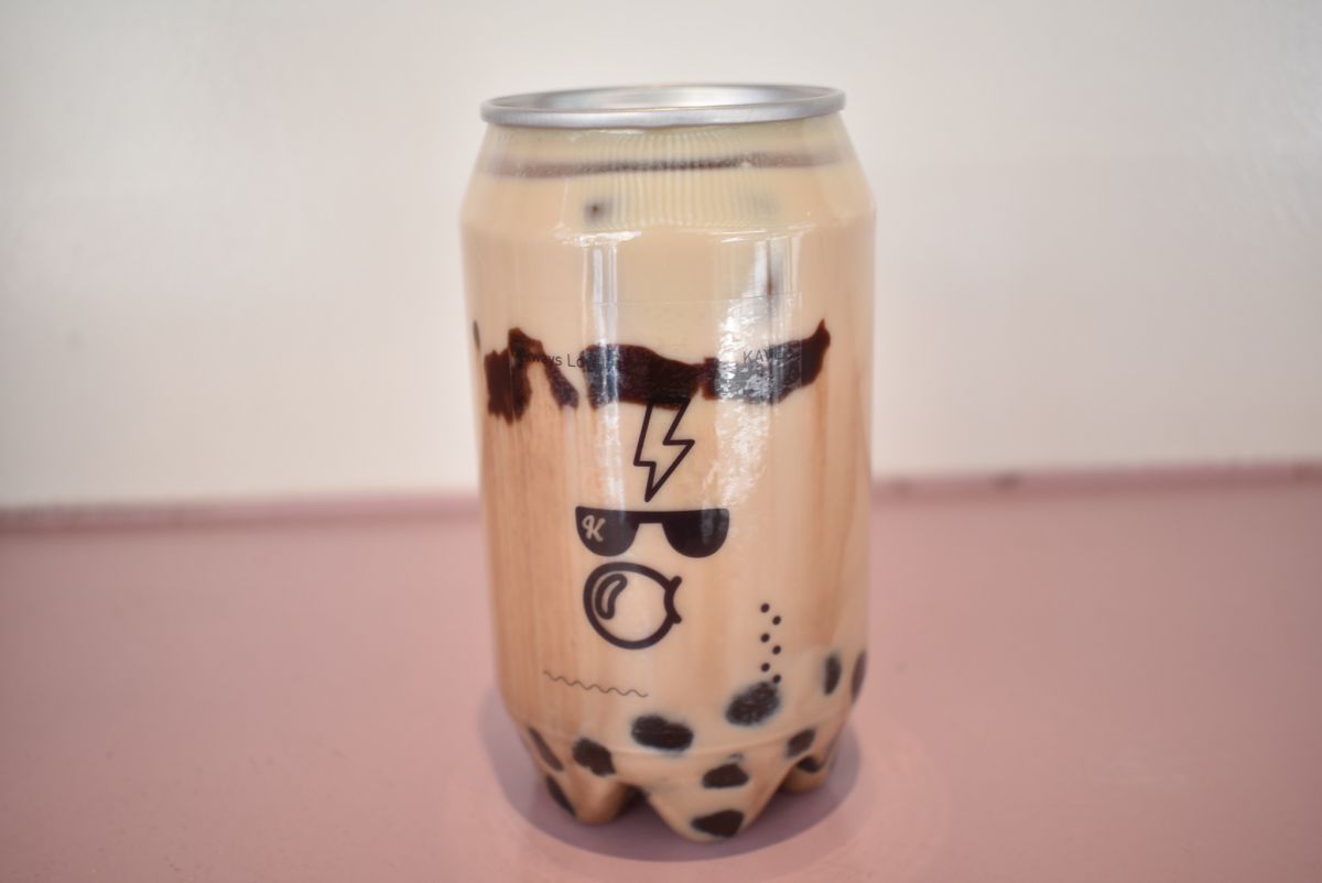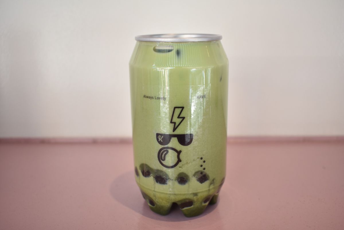 ドリンクの容器は缶とペットボトルを組み合わせたようなデザインで、プルタブを開けて飲みます。側面に描かれた、キャラクターに見立てたお店のロゴもキュート。