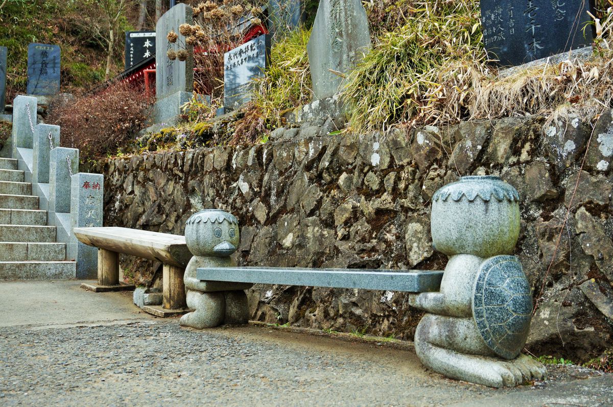 ケーブルカー発着所の御嶽山駅から「武蔵御嶽神社」までは徒歩15分。左手に続く参道と商店街を通り過ぎると、ちょっと急な坂や階段もあるので、まだまだ気が抜けません。ただ、途中にかわいい石像の椅子があるので、要チェック!カッパだけでなく、犬もいるので探してみてくださいね。