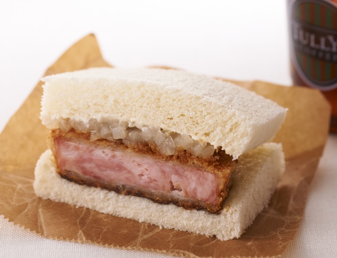 栃木県「宇都宮ハムカツ」を使った「極厚ハムカツサンド」420円は、ボリューム感抜群のサンドイッチ。ワサビソースのピリッとした味わいがアクセントになっています。