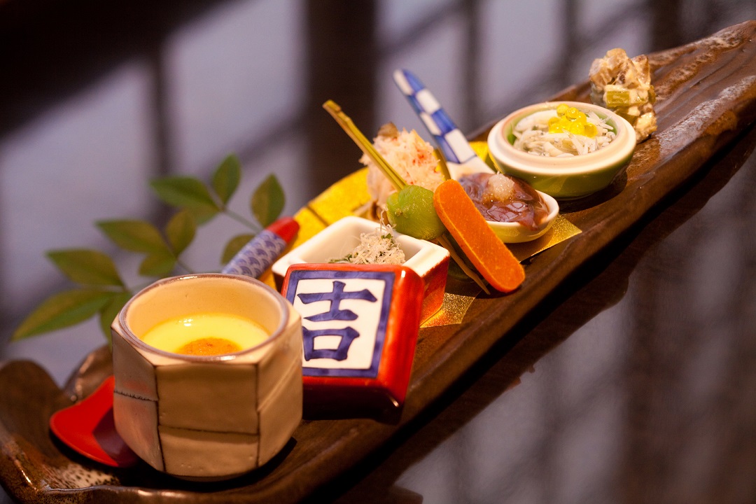 「一の傳」の「一」の字をかたどった皿にのっているのは、ウニの茶碗蒸しや蛍烏賊の沖漬け、花わさびのおひたしなど、旬を味わえる贅沢素材ばかり。小さなひと皿にも料理人の創意工夫が感じられます。