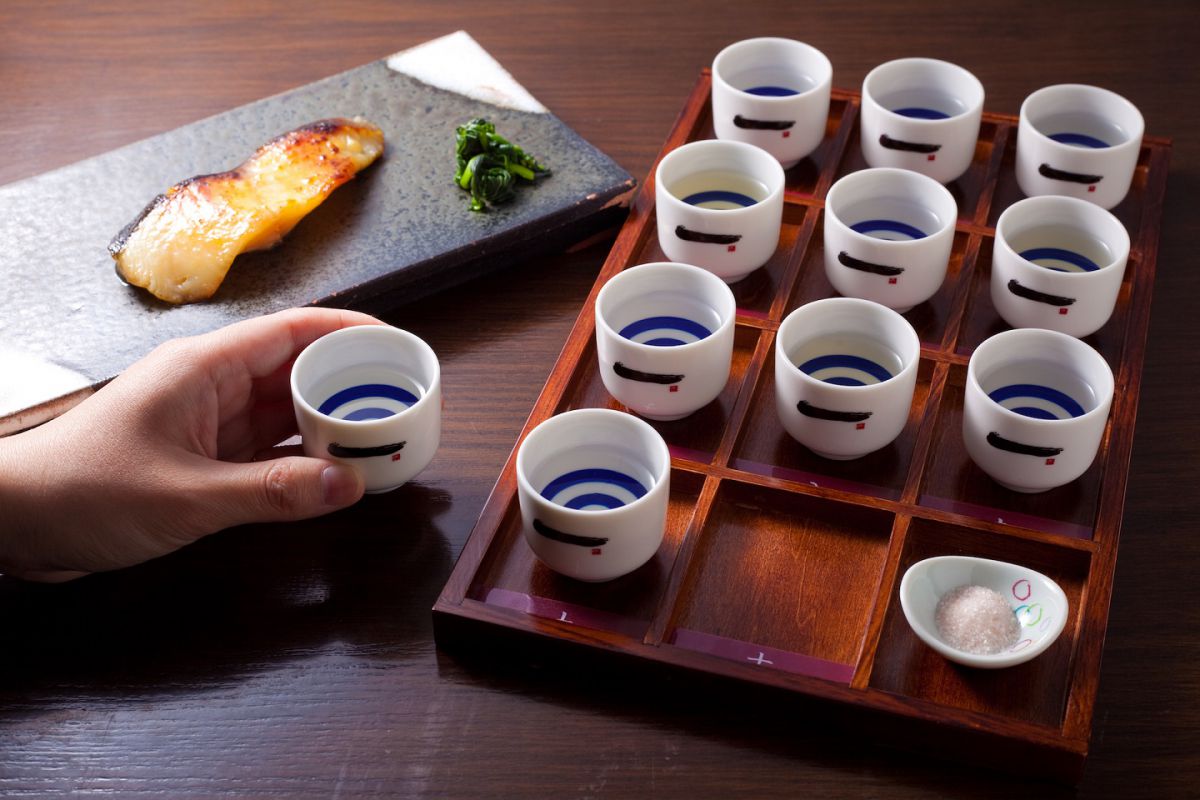 2019年2月からは、京都の11 の酒蔵の日本酒を、コース料理11品に合わせた「11種の日本酒ペアリングセット」が登場。お猪口には20mlほどのお酒が入っており、11種類を味わえて980円(税込)。