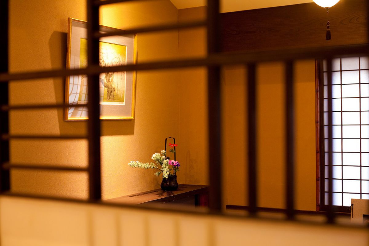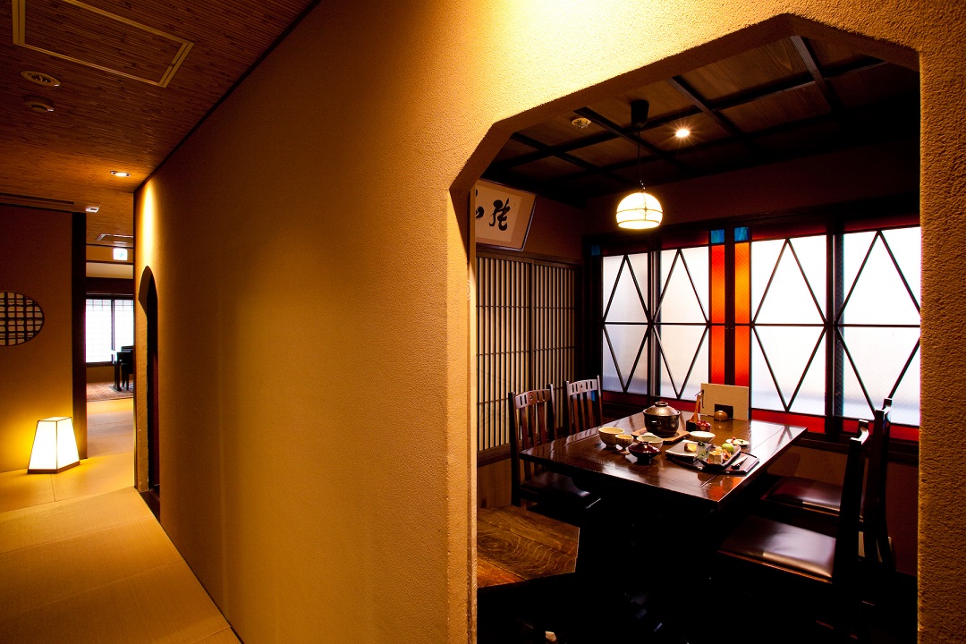 「京都一の傳 本店」の2階の個室は、1室ずつ雰囲気が異なり、こちらには、オーナーが蒐集されたイギリス製アンティークの椅子とテーブルが備えられています。
